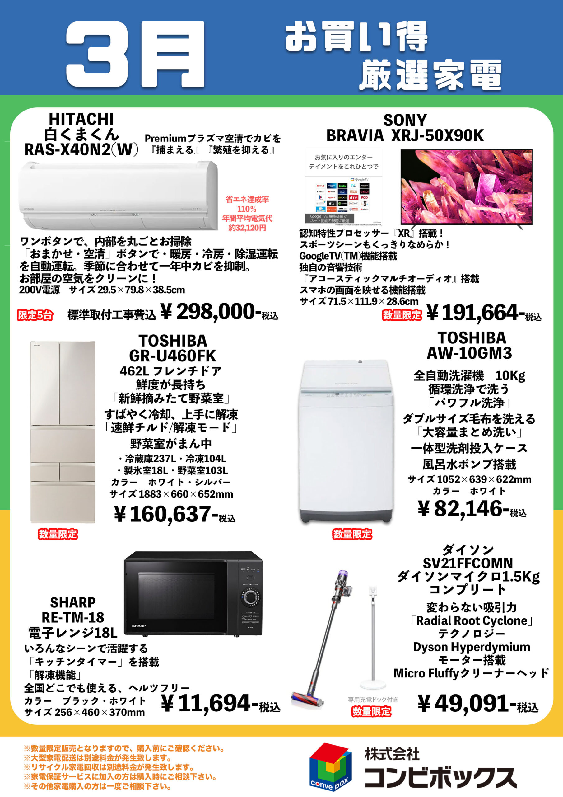 3月のおすすめ家電チラシのお知らせになります。 お買い得厳選家電も数量限定販売致しますので、ご購入希望の方は弊社までご連絡ください。 チラシに掲載のない家電や、お探しの家電価格など、お気軽にご相談ください。 もちろんチラシの掲載金額からの値引きの対応。家電の配送、不要家電の回収、家電の延長保証など、その他サービスもご用意しております。 チラシデータはタップすると拡大致します。